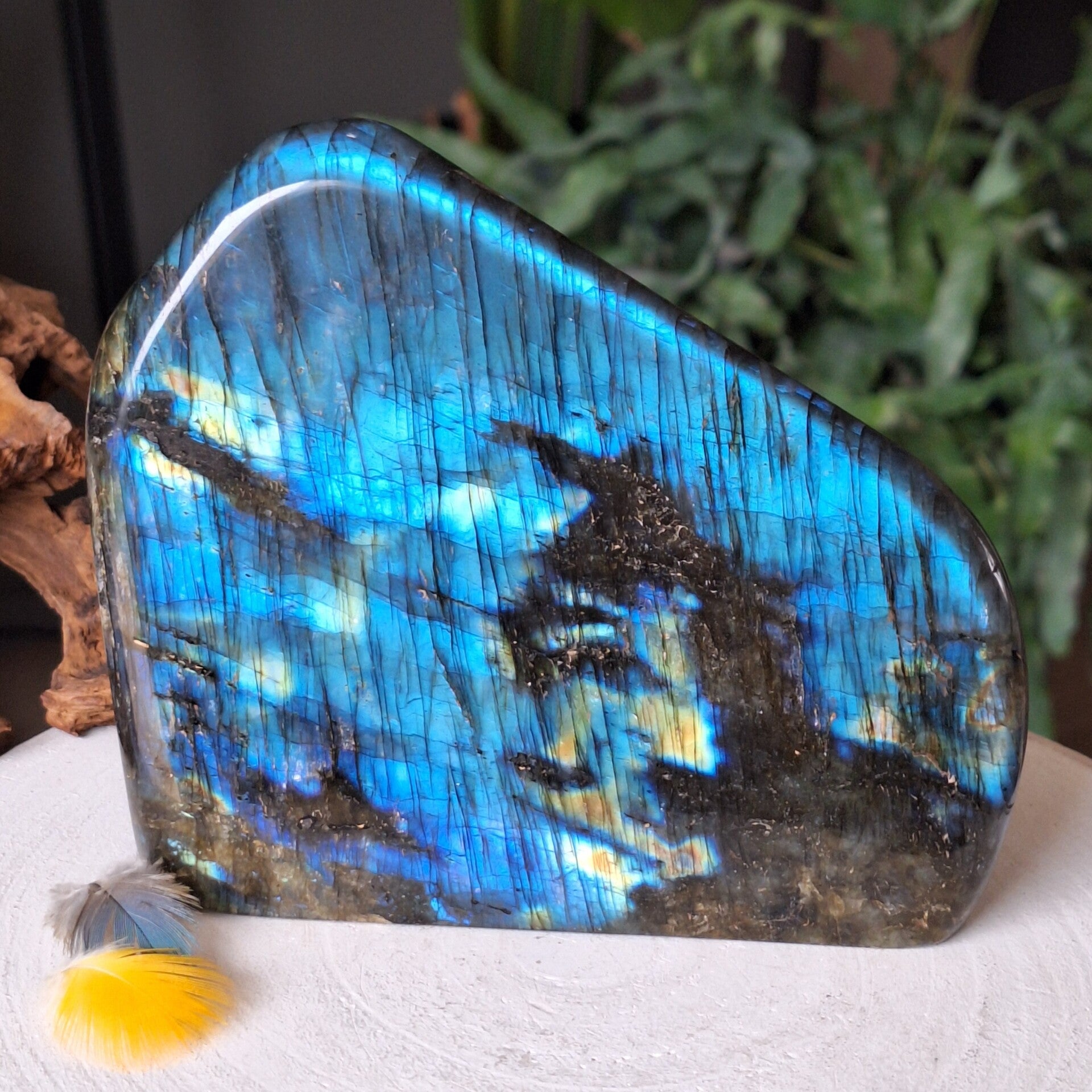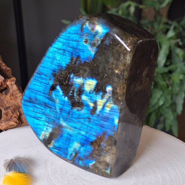 Labradoriet XL freeform sculptuur van maar liefst 2 kilo met prachtige flash. Naast de fantastisch mooie flash heeft deze Labradoriet ook prachtige interne regenboogjes. Dit pronkstuk kan op 3 kanten worden neergezet en is c.a 16x12,2cm en 2 kilo zwaar.