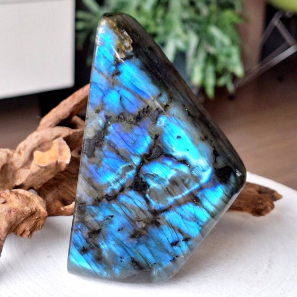 Labradoriet freeform sculptuur met prachtige full flash aan voorkant en achterkant. Op diverse manieren neer te zetten. Echt een fantastisch mooi en groot exemplaar. C.a 13x8cm en 0,6kilo