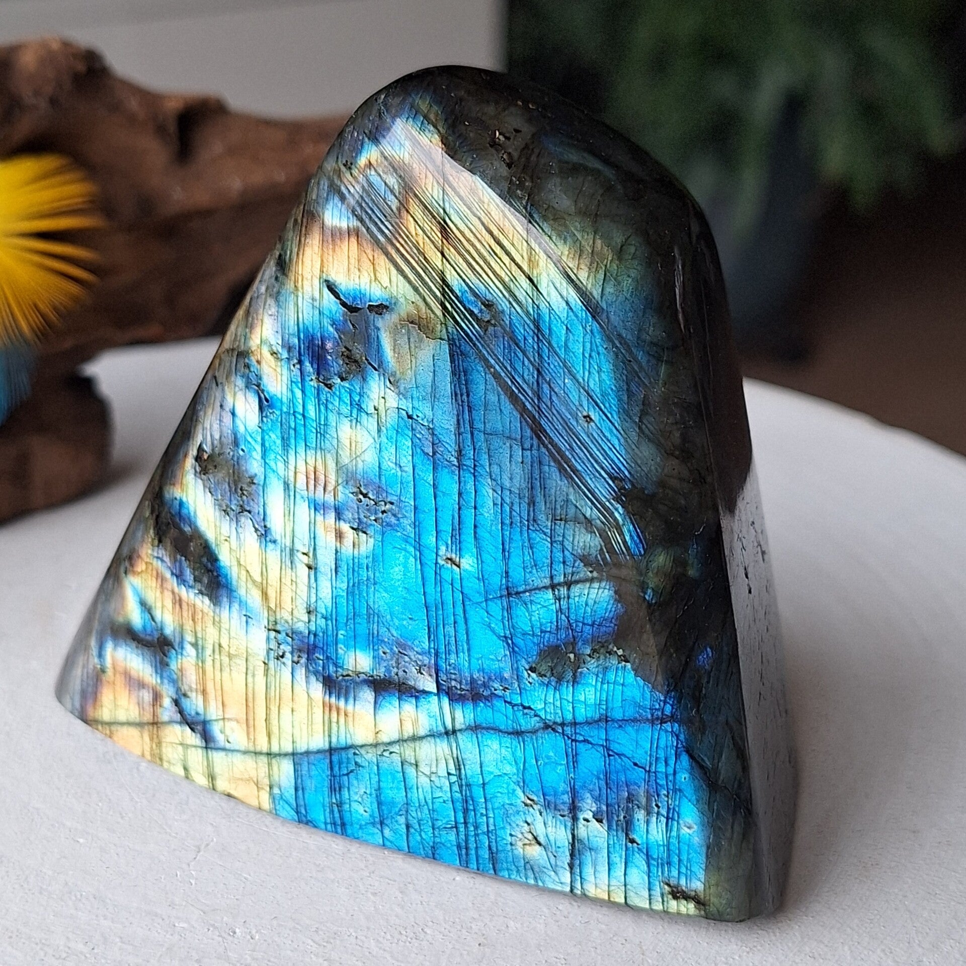 Labradoriet freeform sculptuur met prachtige flash. Ze kan op diverse kanten worden neergezet. Ze is een halve kilo zwaar en heeft een mooi formaat van 10x9,5cm