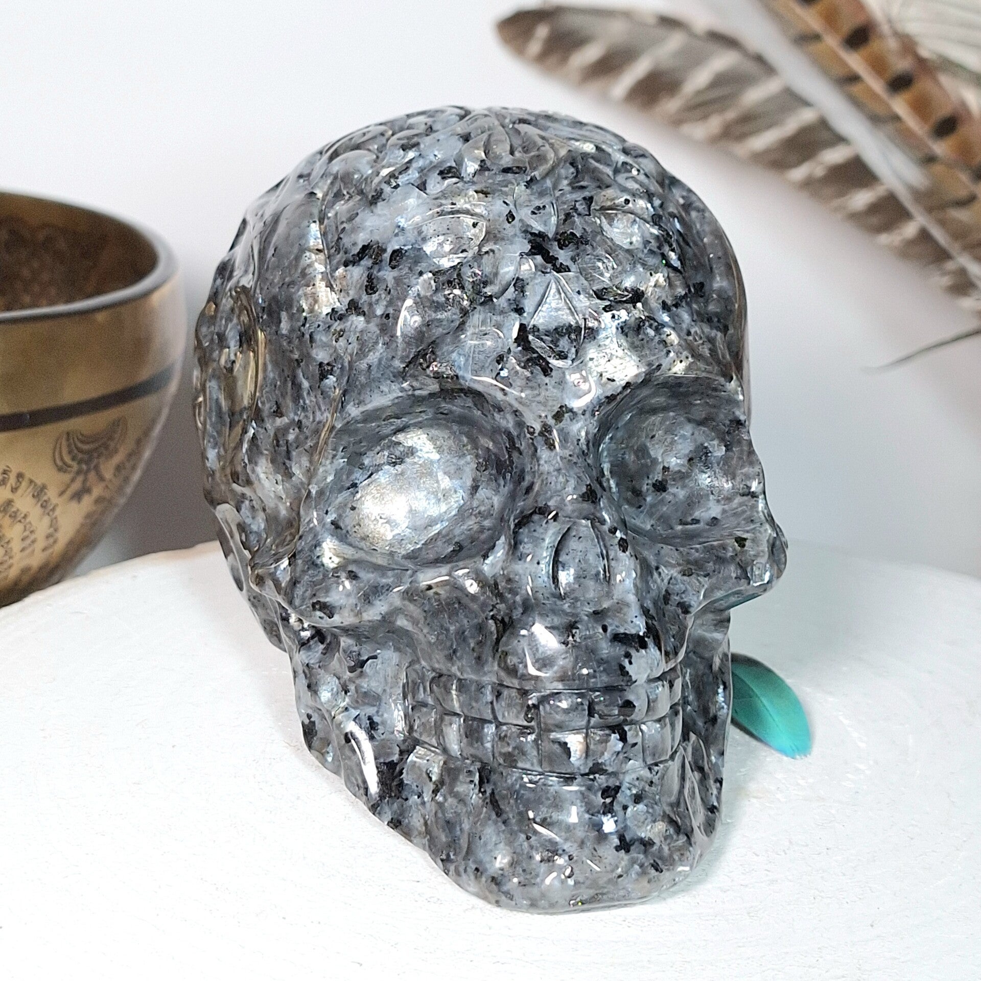 Kristallen Schedel van Larvikiet. Gemaakt van prachtige kwaliteit Larvikiet uit Noorwegen. Bekijk onderaan de pagina de video en voel of er een klik is met deze bijzondere Skull. Deze XL schedel van 1,6 kilo heeft prachtige zilverachtige en blauwe "flash" die extra goed tot uiting komt als er een zonnetje of andere lichtbron op schijnt, prachtig mooi gepolijst waardoor de flash nog beter tot uiting komt. Zeer mooi handgeslepen / gegraveerd met prachtige patronen, dit soort skulls worden ook wel sugar skulls genoemd. Deze unieke, bijzondere schedel vol met oude wijsheden en liefdevolle, krachtige, aardende, heerlijke energie is op zoek naar de juiste persoon /hoed(st)er. Een Skull die je ondersteuning en begeleiding kan bieden op je levenspad. Ook zeer fijn om vast te houden of naast je neer te zetten tijdens meditatie. Tevens is deze Skull zeer geschikt om mee samen te werken in (holistische) praktijken tijdens healingwerk of ceremonies.