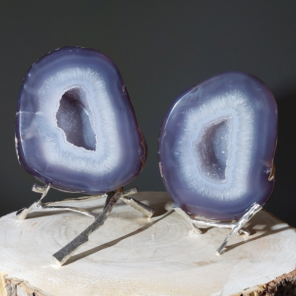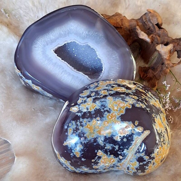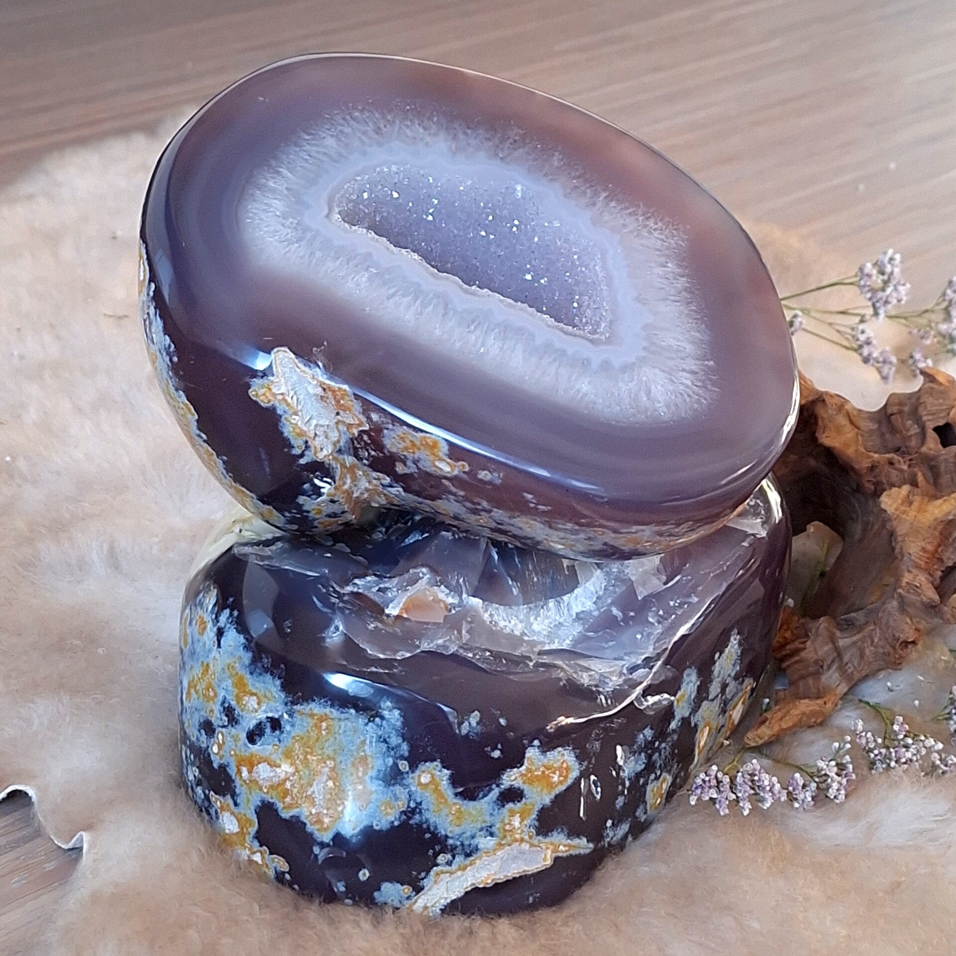 Agaat geode XXL van maar liefst 5,1 kilo. Wat een geweldige creatie van Moeder Aarde is deze prachtige Agaat geode met sprankelende "druzy" kristallen en lijnen van blauwe Chalcedoon. Met haar grote formaat en prachtige uiterlijk zal ze iedere ruimte vullen met positieve energie. Een geweldige aanwinst voor iedere ruimte, voor oa thuis, kantoor, praktijk en salon. De twee helften op de foto's horen bij elkaar. Ze zijn als geode open gemaakt en de binnenkant is gepolijst. Ze zijn verbonden met elkaar en zijn dus ook alleen als set te verkrijgen. Wel zou het eventueel mooi zijn om 1 helft weg te geven aan iemand waar je veel van houdt. Ze zullen symbool staan voor de liefde tussen jullie en zal de verbinding zal versterkt kunnen worden. Het laat blijken dat je op welke manier dan ook bij elkaar hoort net zoals de twee helften van de geode.