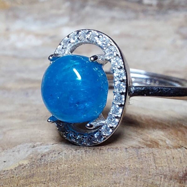 Prachtige ring met fantastische kwaliteit Apatiet. De ring is van 925 zilver en de rand is bedekt met zirkoon steentjes. Het is een verstelbare ring. Geschikt voor de meeste vingers.