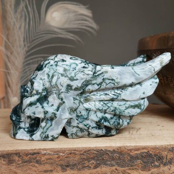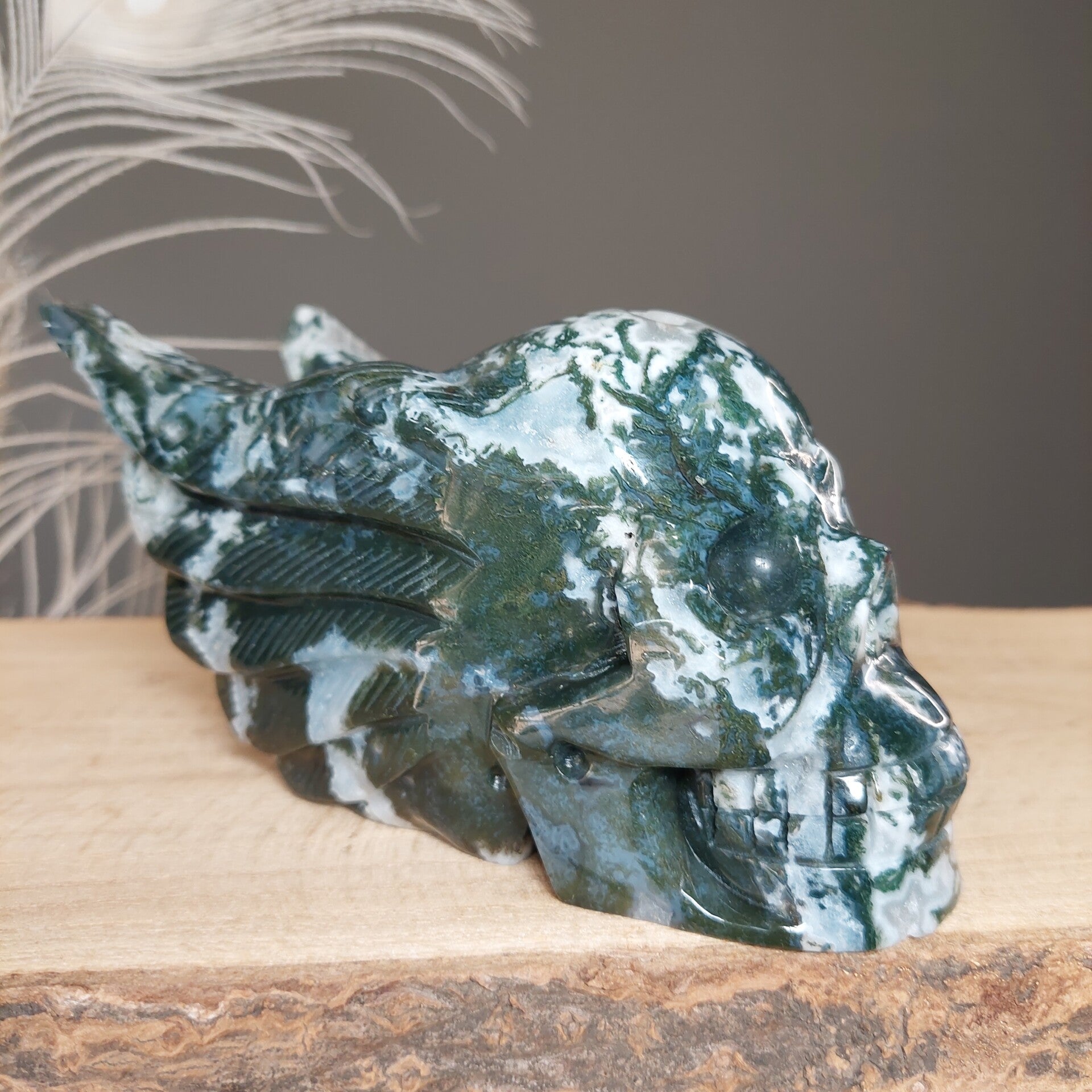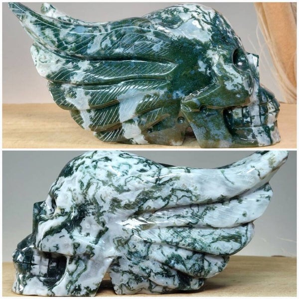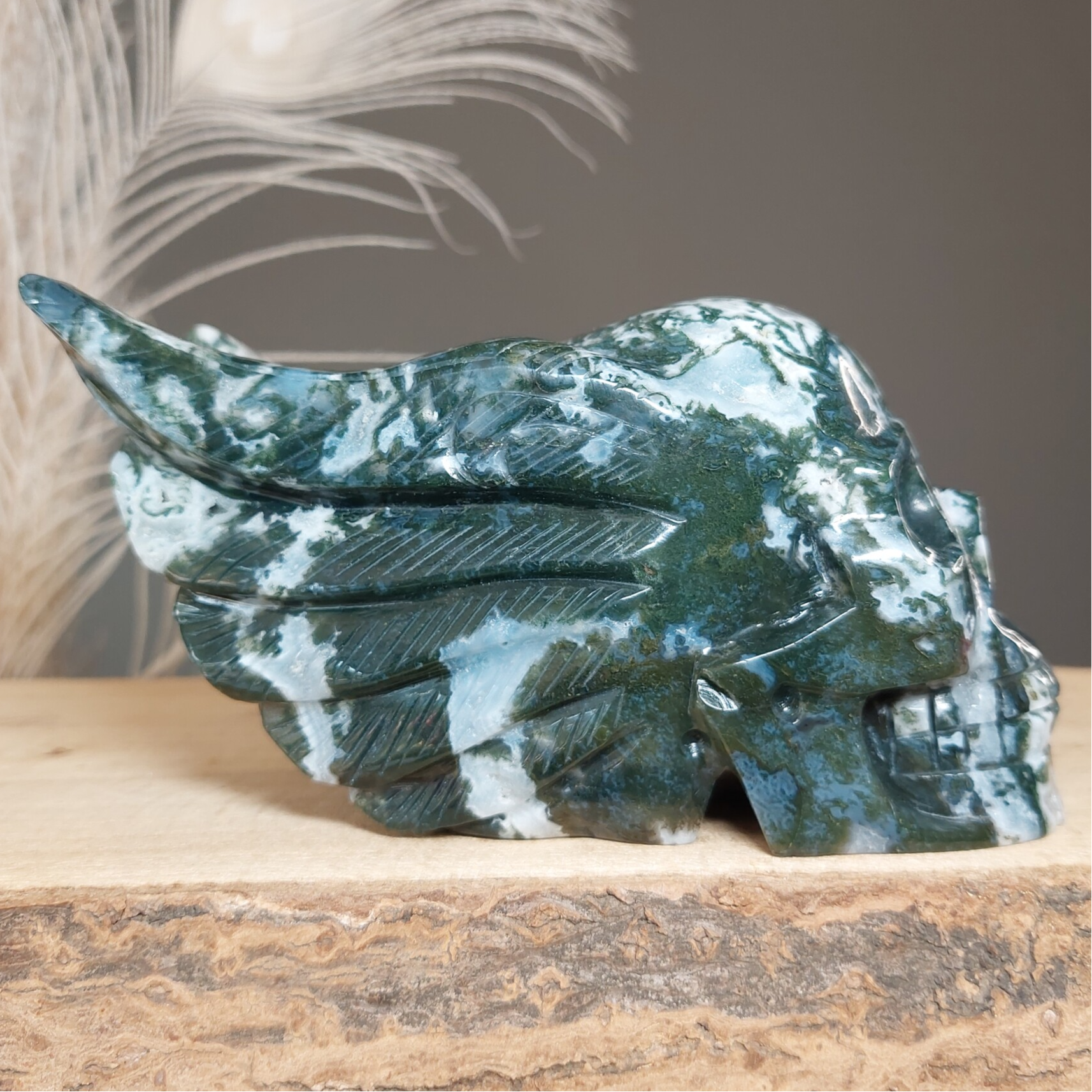 Wat een beauty is deze prachtige skull met wings. Enorm mooi, groot exemplaar met fantastische patronen. De ene kant is Mosagaat en de andere helft Boomagaat, hoe uniek is dat? Groot exemplaar van 18cm en 1,1kilo.