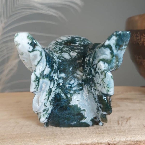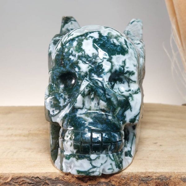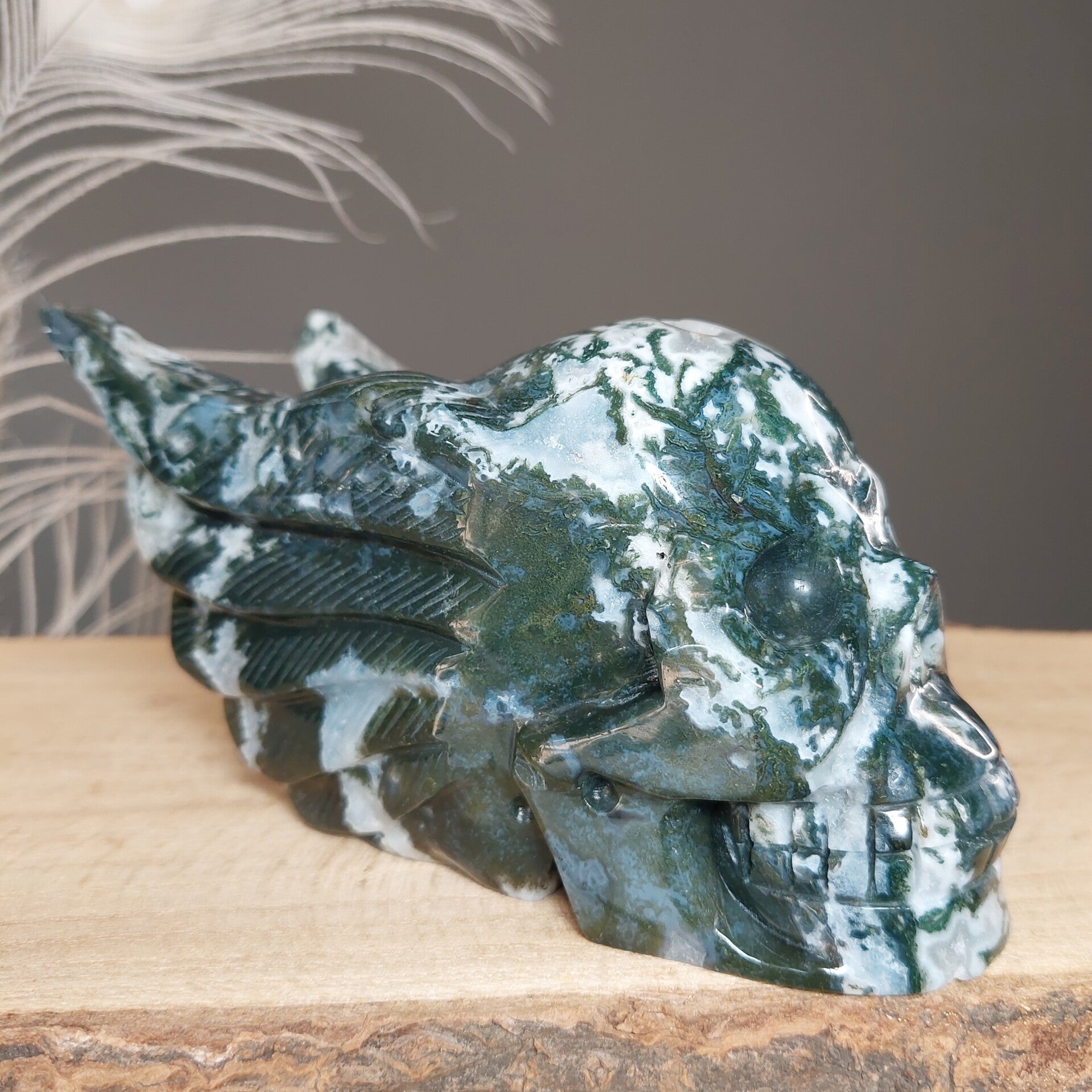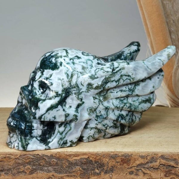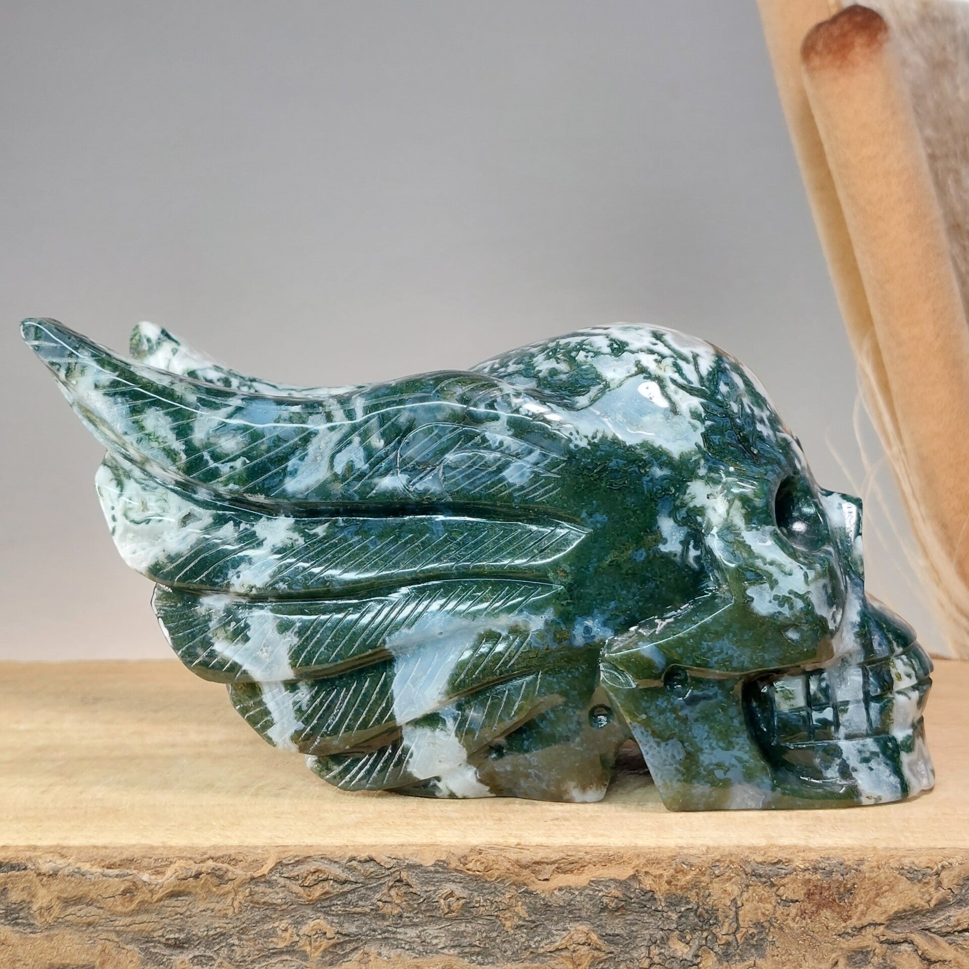 Wat een beauty is deze prachtige skull met wings. Enorm mooi, groot exemplaar met fantastische patronen. De ene kant is Mosagaat en de andere helft Boomagaat, hoe uniek is dat? Groot exemplaar van 18cm en 1,1kilo.