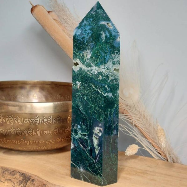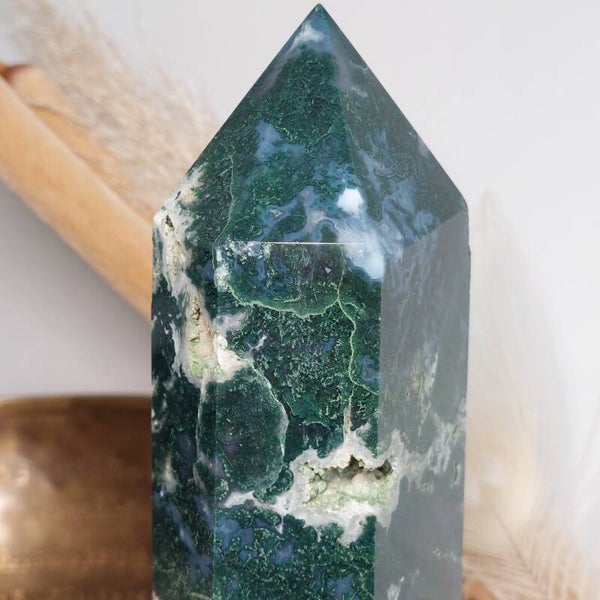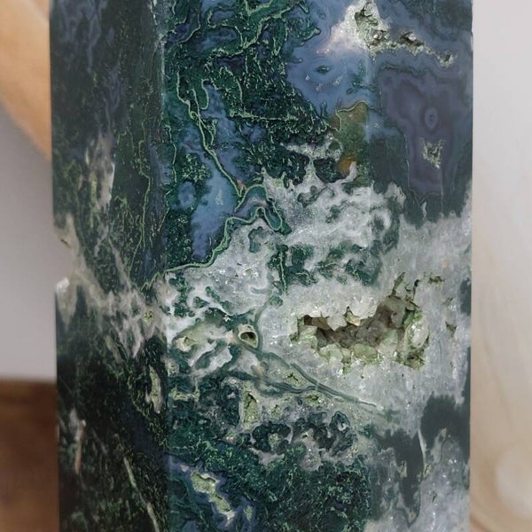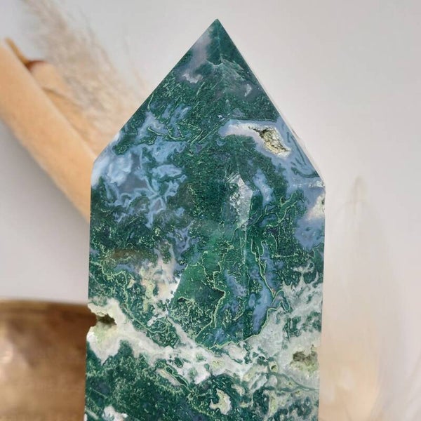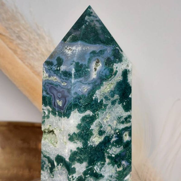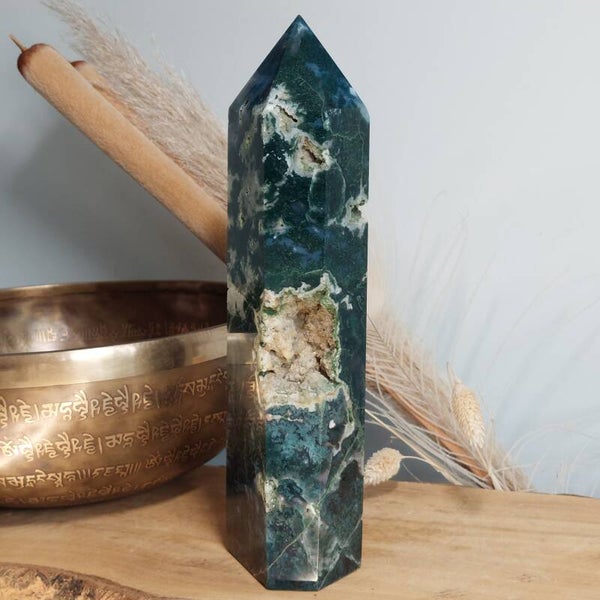 Prachtige Mosagaat toren van 1,8kg en 26cm. Prachtig als aanvulling op het interieur, mooi statementpiece / eyecatcher. Heeft een prachtig ruwe stuk moedergesteente, vele kristallen etc. Je raakt niet uitgekeken op dit stuk.
