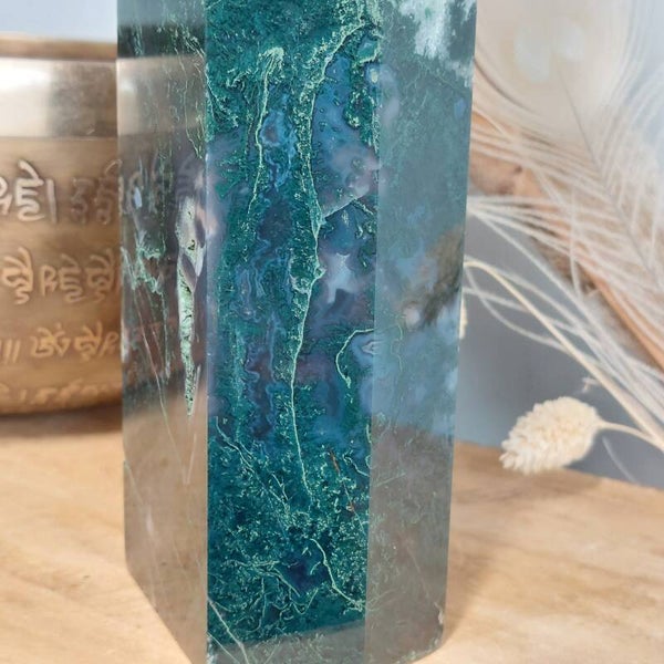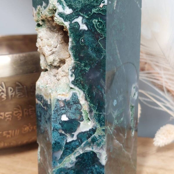 Mosagaat. Prachtige XXL Mosagaat toren van 1,8kg en 26 cm Prachtige patronen, kristallen en lichtblauwe Chalcedoon