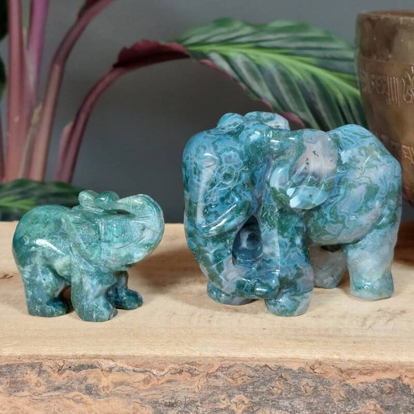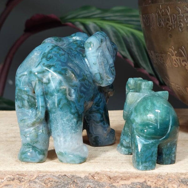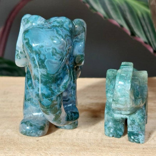 Deze olifanten set is fantastisch om bijvoorbeeld cadeau te geven aan een moeder na de bevalling De olifanten zijn van top kwaliteit met prachtige patronen. Fantastische tekening met lichtblauwe Chalcedoon en hier en daar mooie druzy kristallen. Grote olifant is c.a 270 gram en 9,8cm kleintje is 6,4cm
