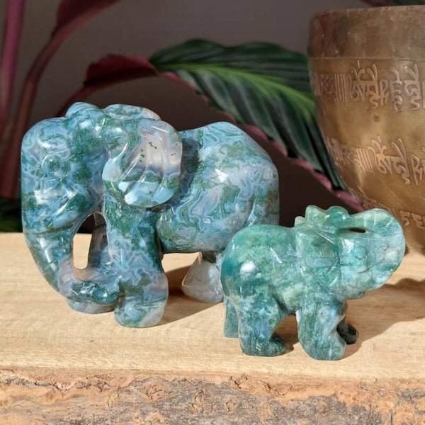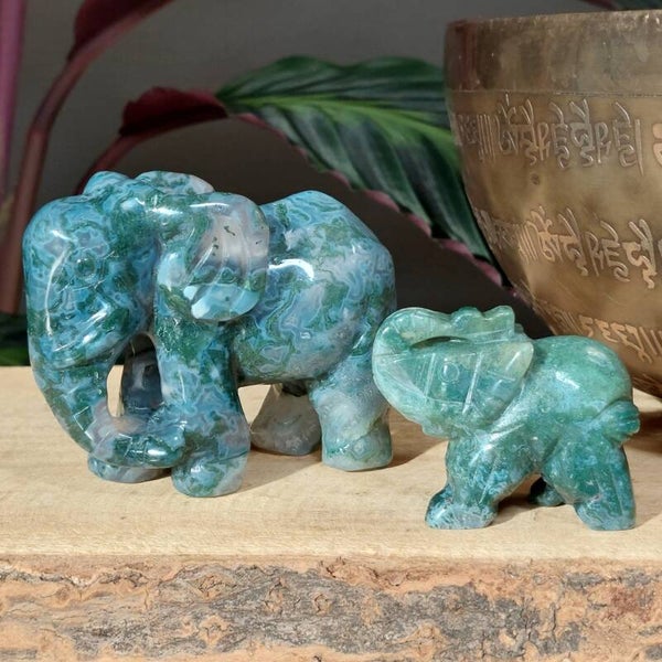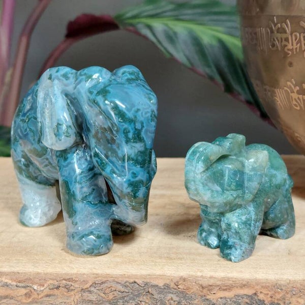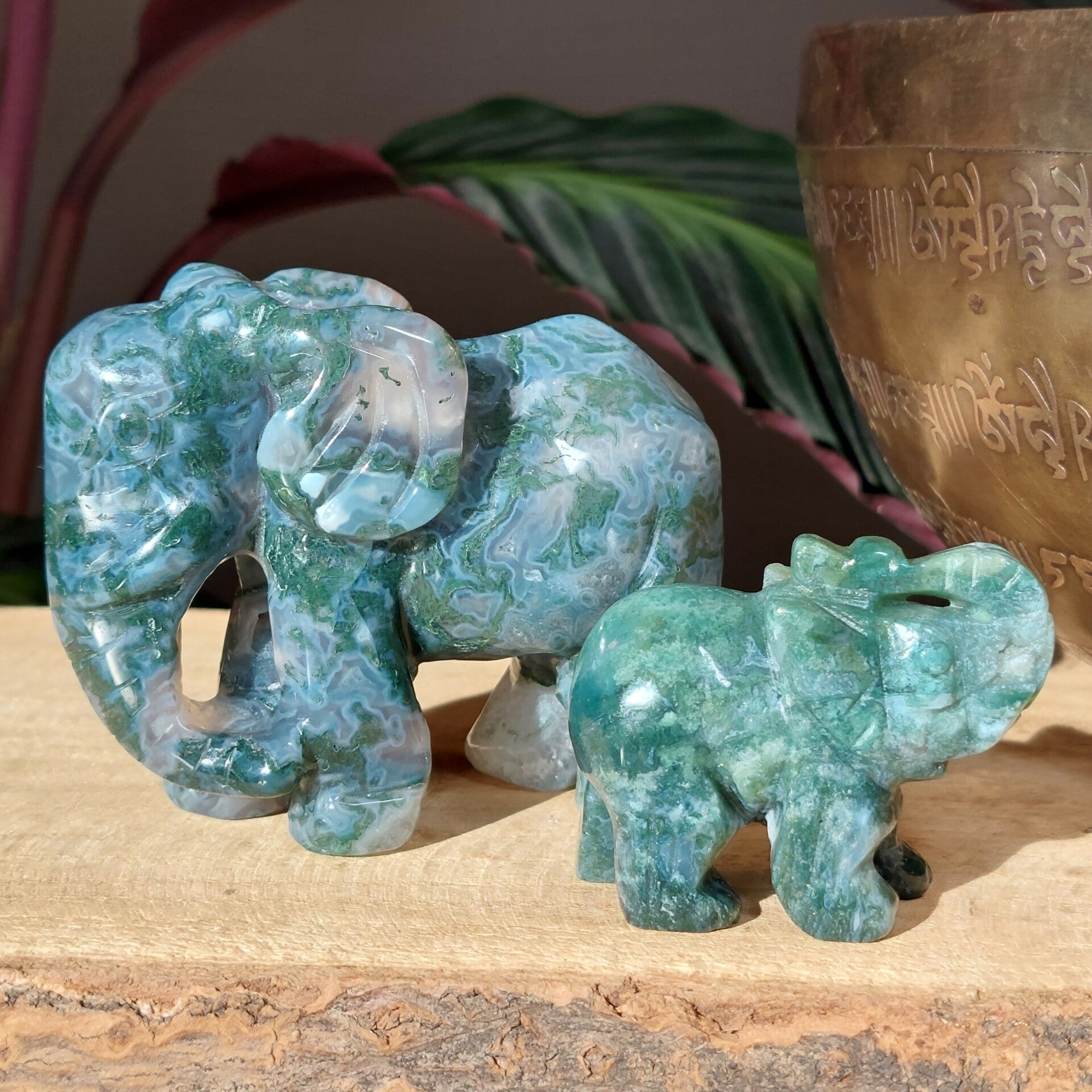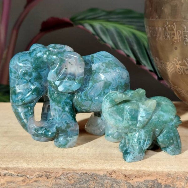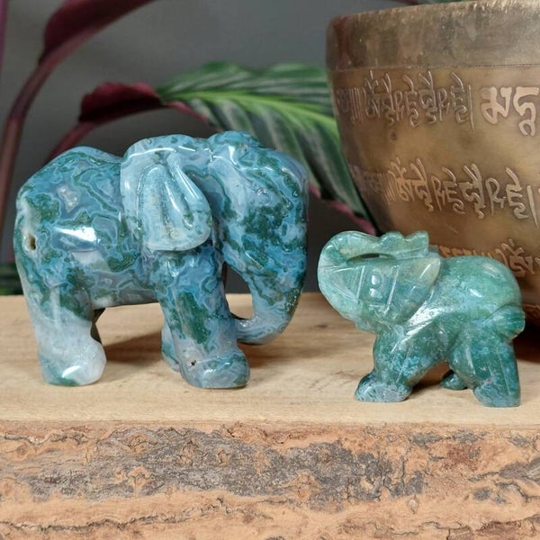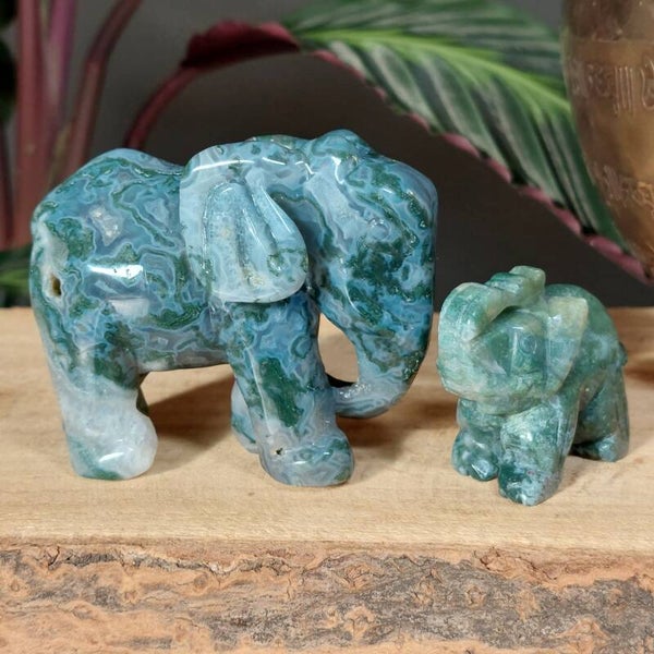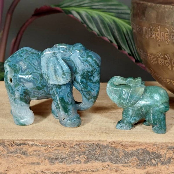 Mosagaat olifanten set, fantastisch mooie kwaliteit met uitzonderlijk prachtige tekening. c.a 9,8 en 6,4cm cm