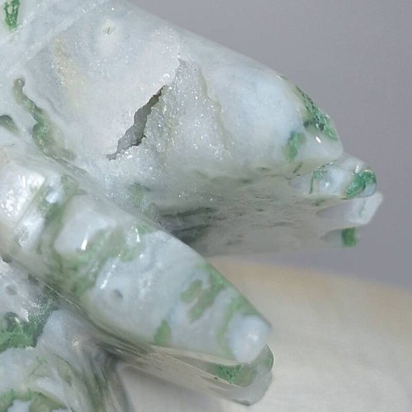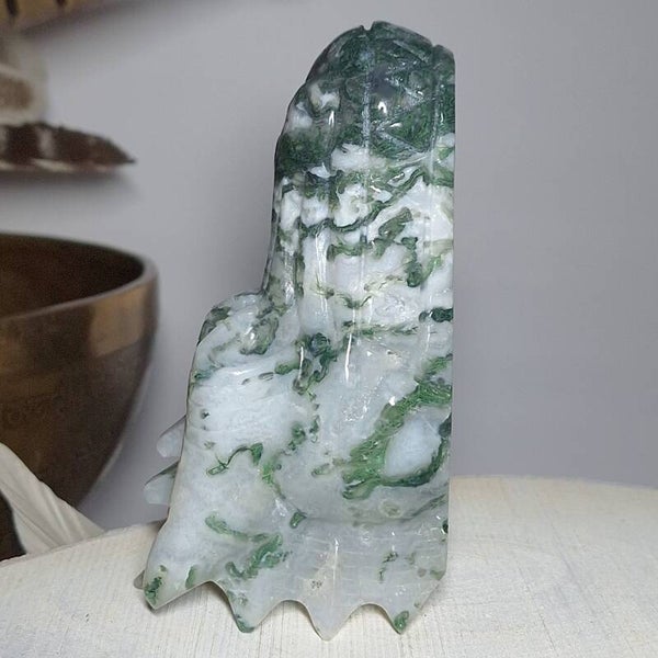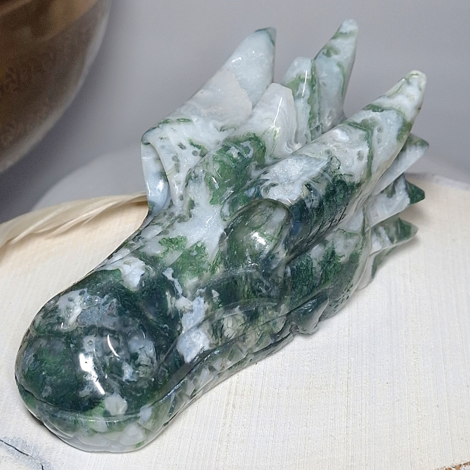 Mosagaat met Boomagaat Draak. Skull, drakenschedel erg bijzonder met prachtige patronen en druzy kristalletjes.