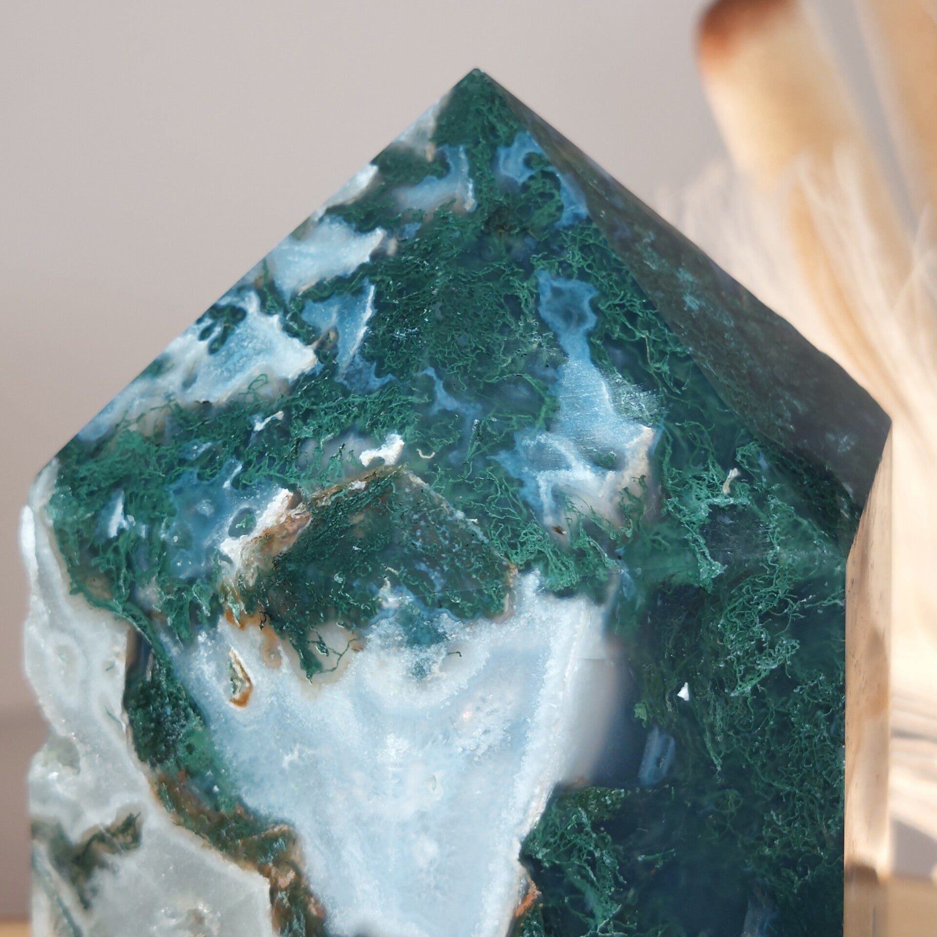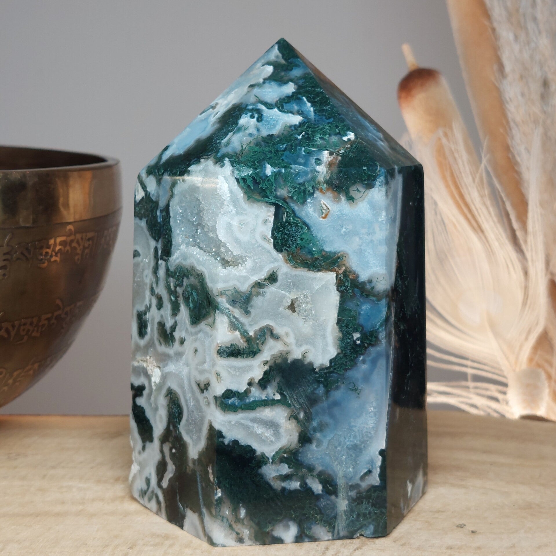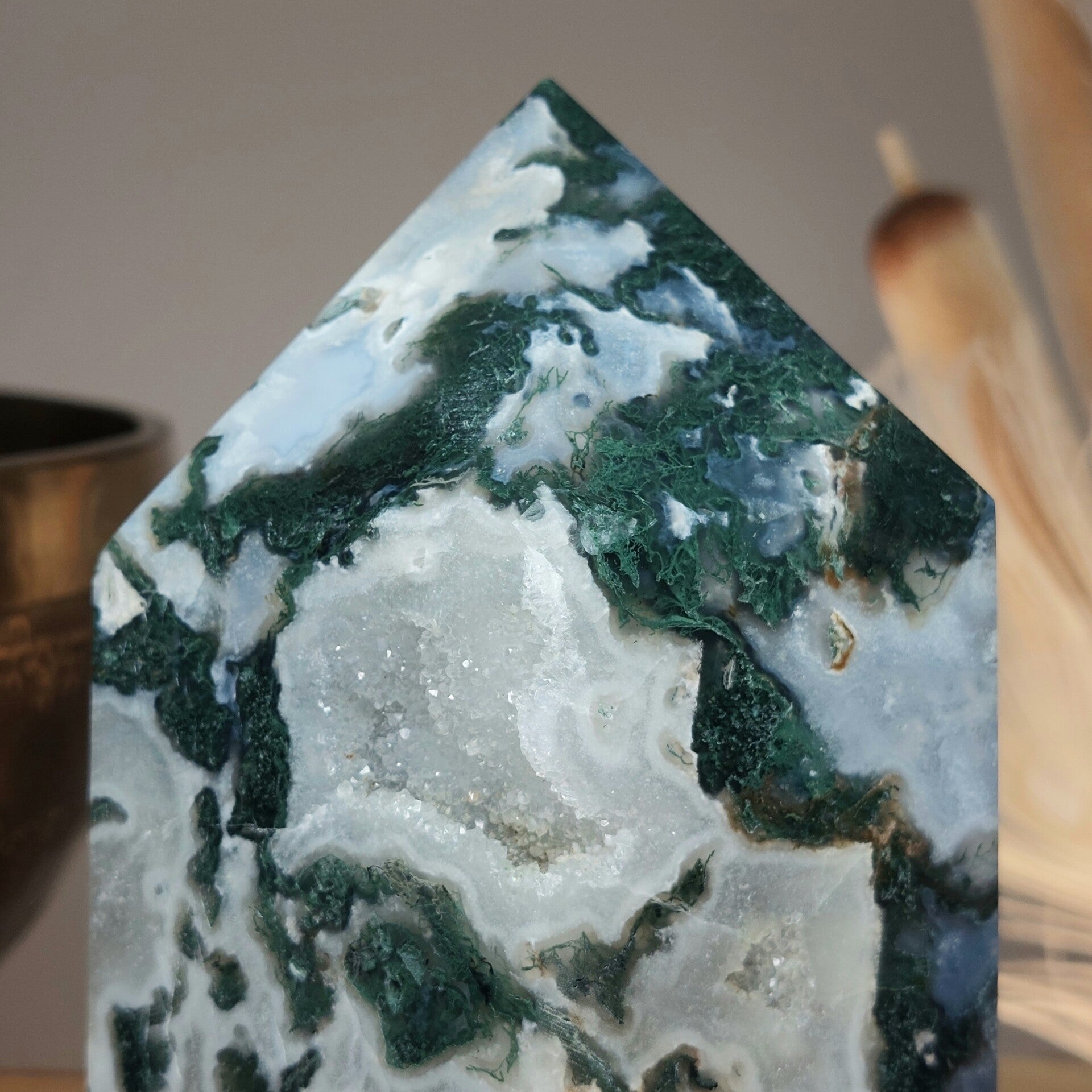 Prachtige Mosagaat toren van 14,5x9,6 cm en 1570 gram. Prachtig groot exemplaar met mooie patronen en prachtige kristalletjes in geode, een echte eyecatcher.