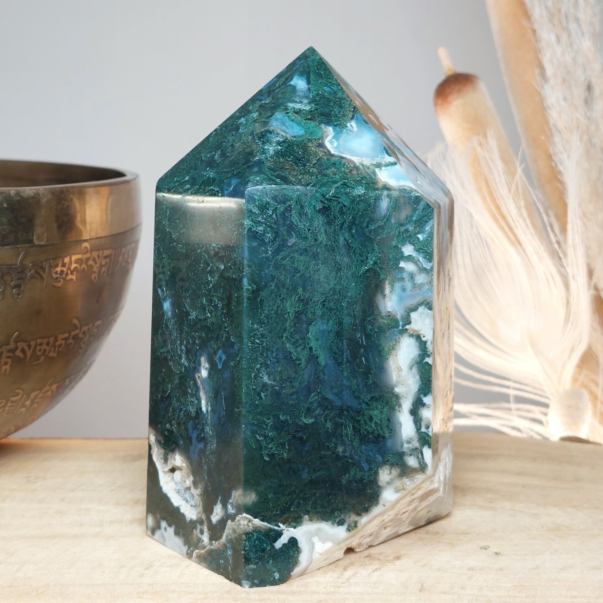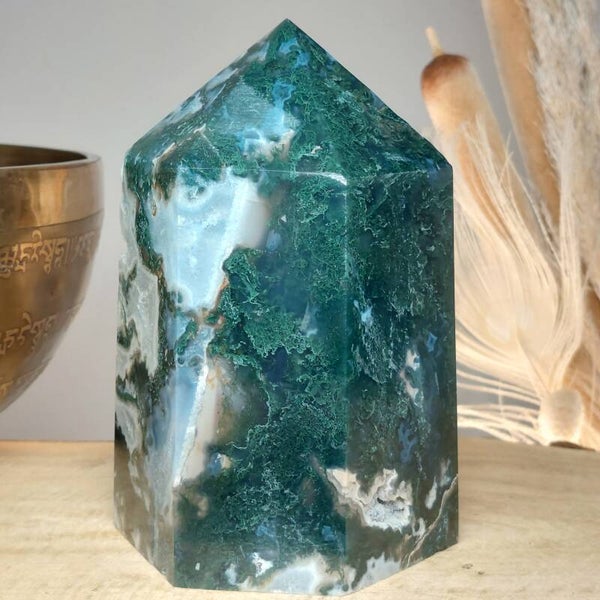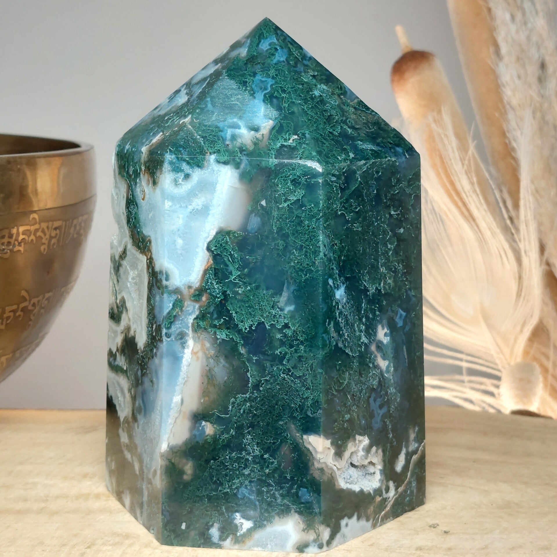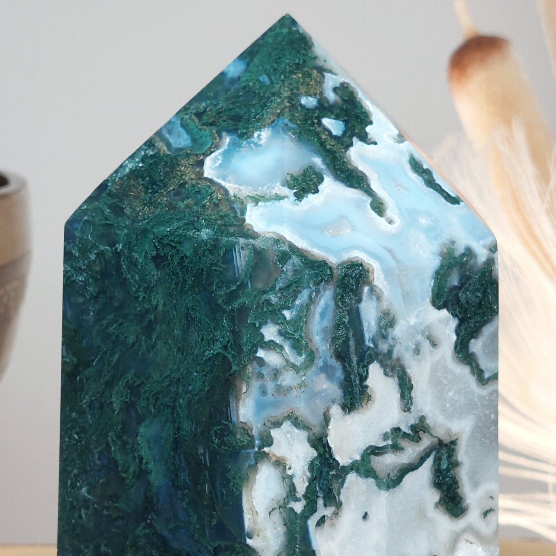 Prachtige Mosagaat toren van 14,5x9,6 cm en 1570 gram. Prachtig groot exemplaar met mooie patronen en prachtige kristalletjes in geode, een echte eyecatcher.